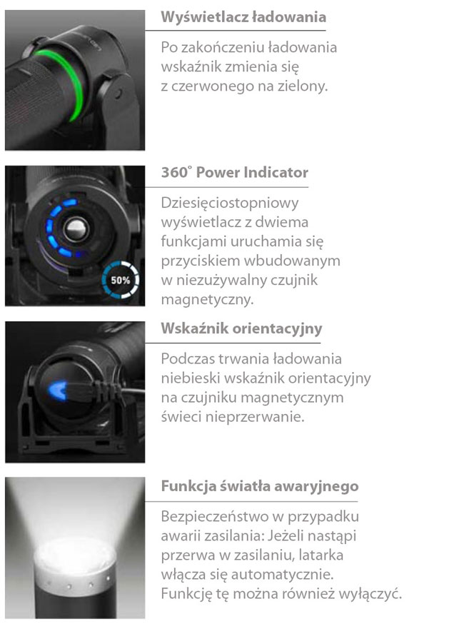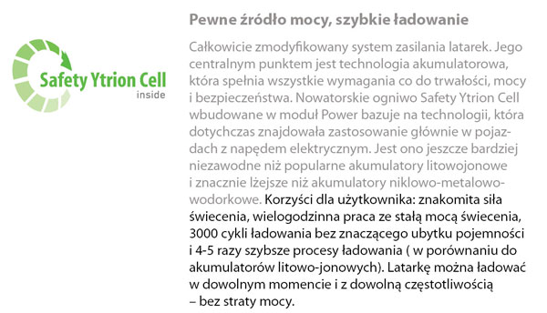 | Właściwości: • Optymalny czas świecenia • Smart Light Technology (SLT) z mikrosterownikiem • Advanced Focus System (AFS) Równomierny krąg światła (rozproszonego) Ostra wiązka światła dalekiego zasięgu (skupionego) • Speed Focus (skupienie wiązki jedną ręką) • Fast Lock (blokada skupienia wiązki) • Safety Ytrion Cell • Floating Charge System Pro • Funkcja światła awaryjnego • Wskaźnik orientacyjny • Wskaźnik ładowania • 360 stopni Power Indicator |