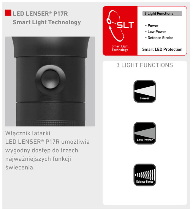 Smart Light TechnologyInnowacja sprawia, że Ledlenser staje się Twoim osobistym narzędziem: Poprzez mikrokontroler programujesz różnymi kombinacjami przycisków i przełączników Twój indywidualny zakres funkcji. W ten sposób masz zawsze pod ręką optymalną funkcję oświetlenia. |